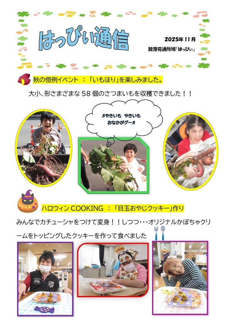 鼓澄苑の通所「はっぴぃ」で、毎年恒例の【いもほり】と利用者考案、【ハロウィンCOOKING:「目玉おやじクッキー」作り】を開催しました。
