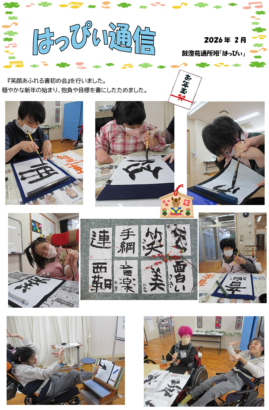 鼓澄苑の通所「はっぴぃ」で、毎年恒例の【書初め会】を開催しました。